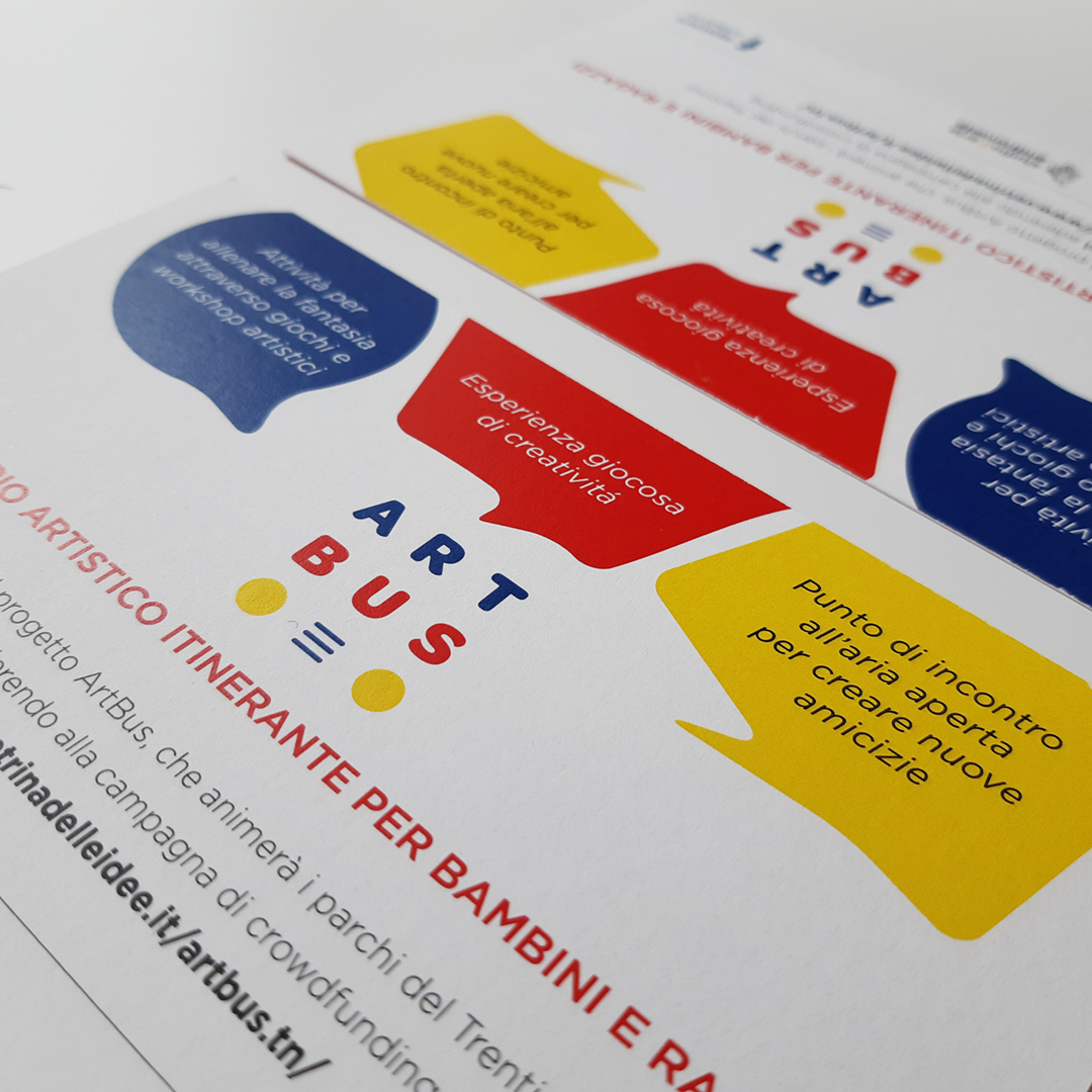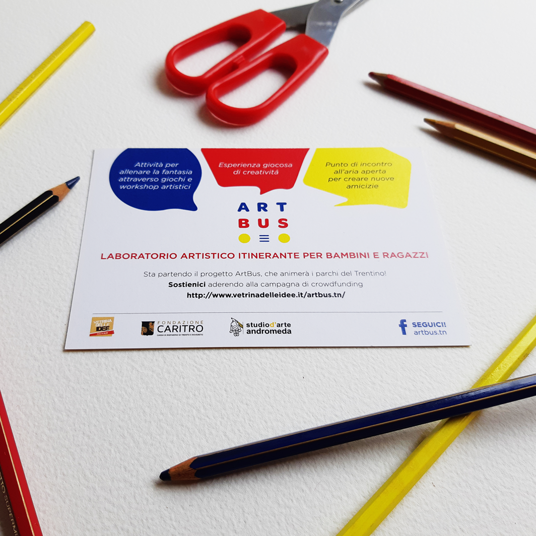 Laboratorio artistico itinerante per bambini e ragazzi: marchio e cartolina di lancio dai toni giallo, rosso e blu. Si parte dai colori primari per poi creare un bellissimo percorso fatto da mille colori e tanto divertimento.