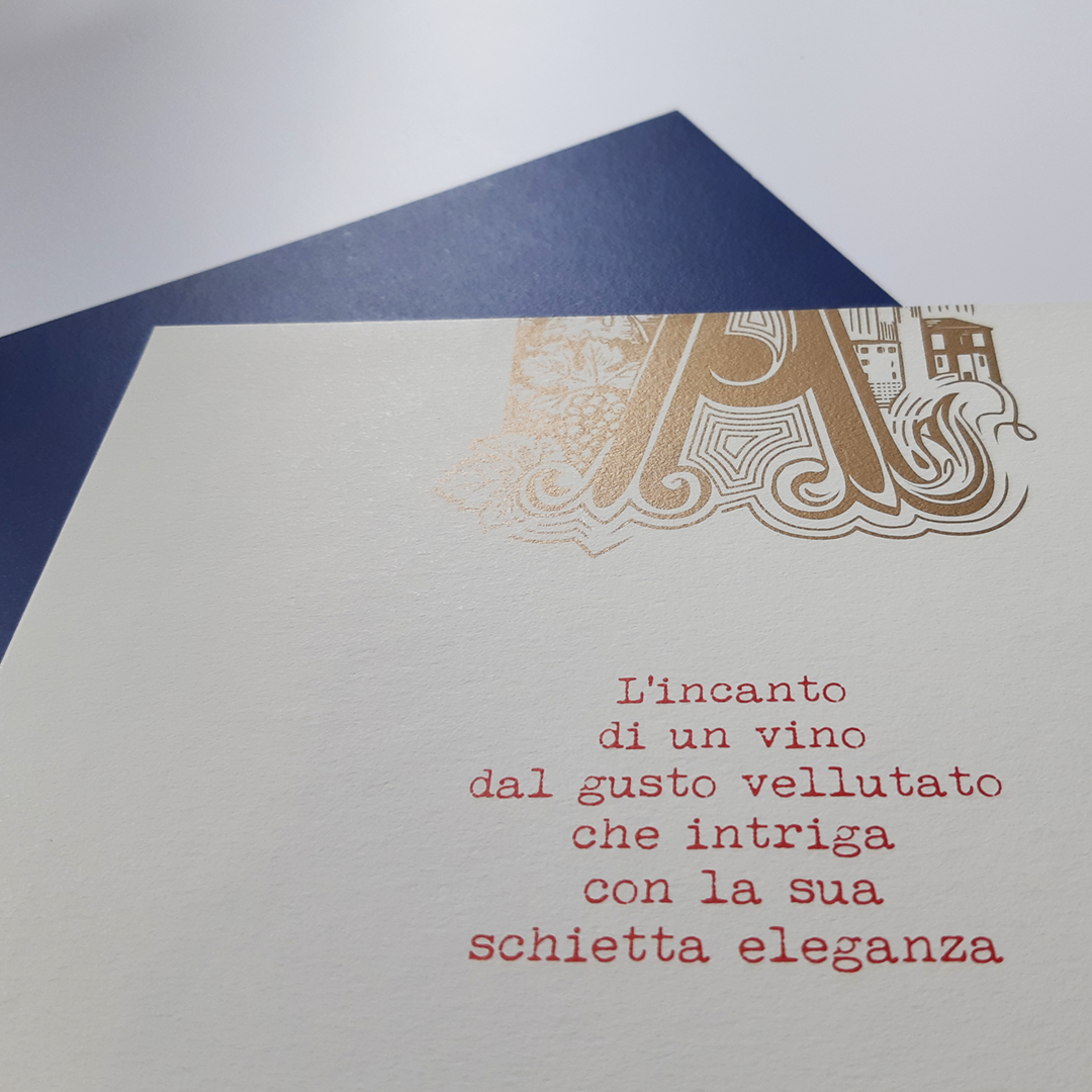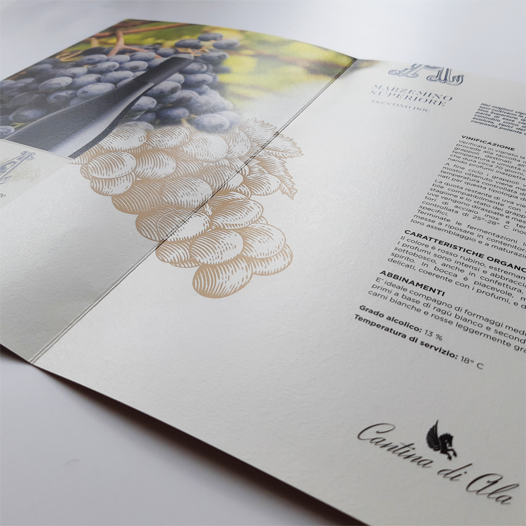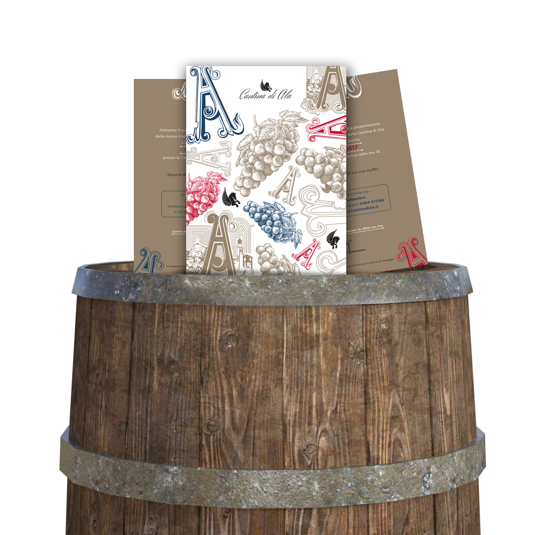Cartolina, depliant e roll-up, ideati per l’evento di presentazione dei Marzemini della Cantina Sociale di Ala, giocano con i colori e i segni grafici delle due etichette.