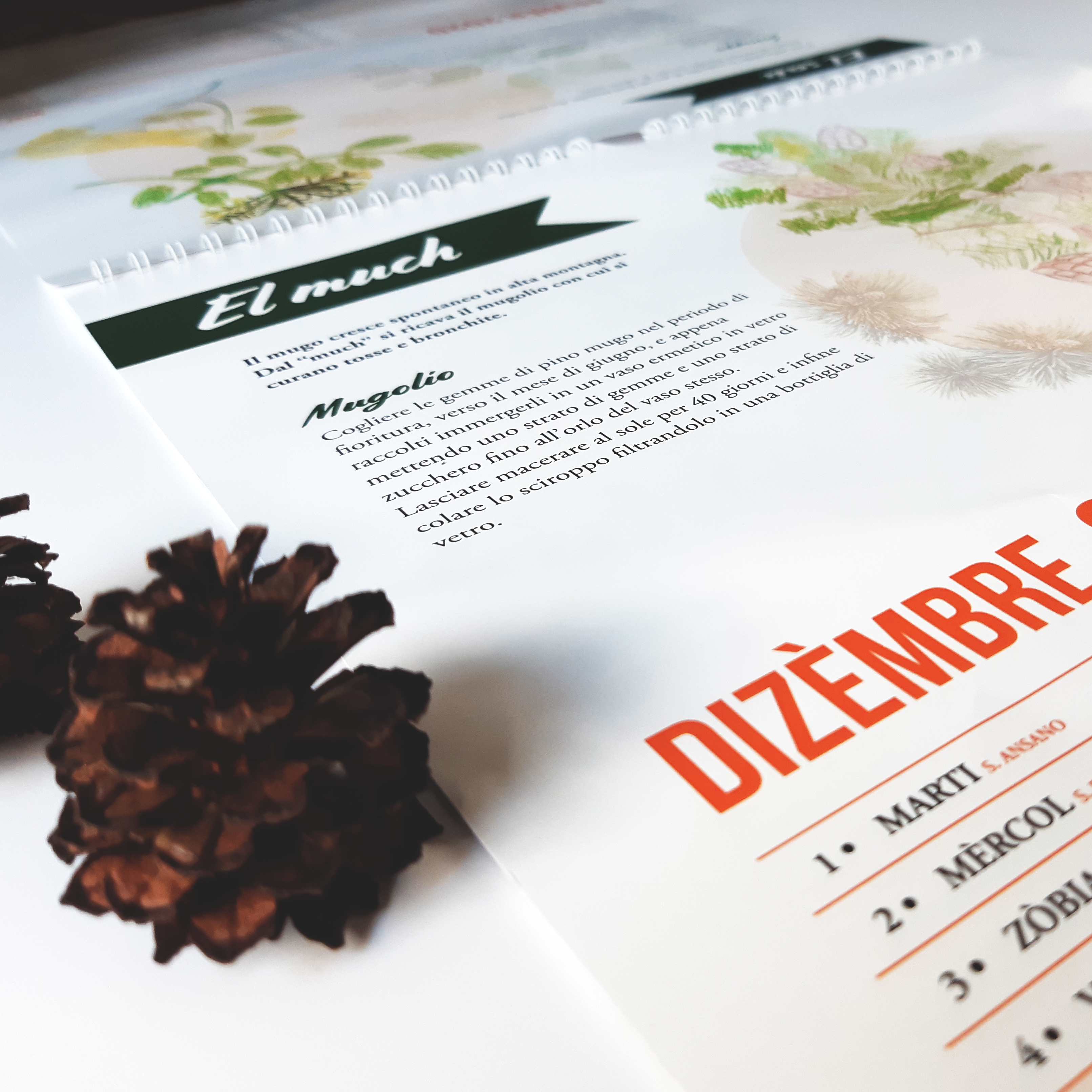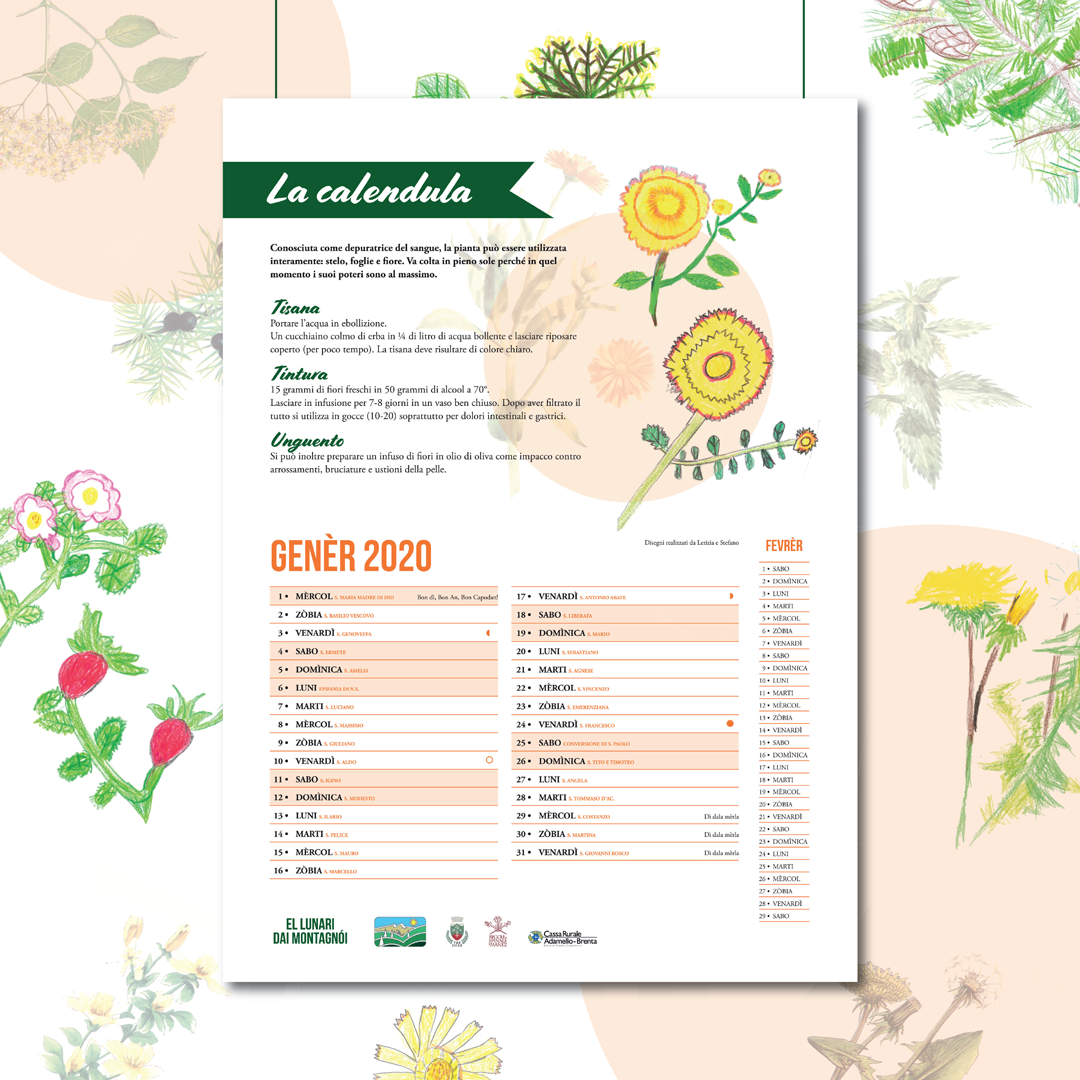 Calendario a tema “erbe selvatiche locali” con grafiche, immagini e disegni dei bambini del posto.